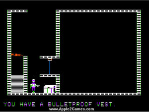 The Apple II version used simple graphics with stick figure characters and basic room layouts. Despite the simple visuals, the game created tension through its sound effects and gameplay. Opening chests took time and made noise that could alert guards. You had to hold down keys to search, adding risk to every action.
