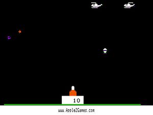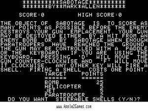 Sabotage was a classic Apple 2 game where the player tried to shoot down helicopters and planes as they flew over. As the helicopters fly over parachutists jump out in an attempt to reach the ground and gather their forces to destroy your gun. Once four (4) are able to reach the ground they paratroopers will then blow up your gun turret.